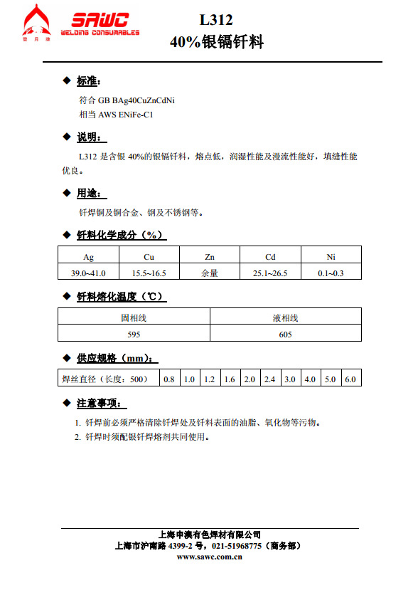 HAG-40BCd銀焊條(含銀40%銀焊條)等同于國標BAg40CuZnCd及L312,是銀、銅、鋅、鎘、合金,熔點低、焊接工藝性優(yōu)良,適用于淬火鋼和小薄件零件的釬焊。熔點600-630攝氏度。